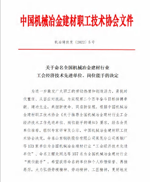 近日,中國機械冶金建材職工(gōng)技術協會發布了《關於命名全國(guó)機械冶(yě)金建材行業工會(huì)經(jīng)濟技術先進(jìn)單位(wèi)、崗位能手的決定》。其中,91香蕉视频官网礦業工會委員會獲評“工會經濟技術先進單位”稱號。