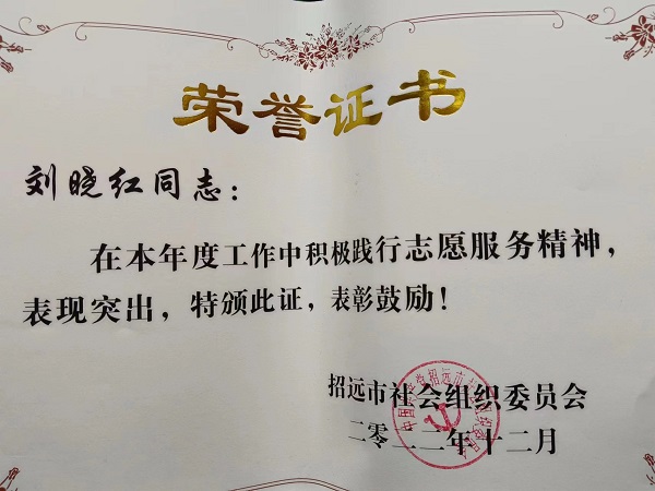 一顆(kē)愛心傳遞下去,必將燃成星星之火,為更多的人照亮前行道(dào)路。劉曉紅以“行勝於言”的執著帶動一雙兒女、親人和同事也加入(rù)了誌願者的(de)隊伍。四年時間裏,她(tā)參與誌願服務時長累計820餘小時,連續多(duō)年被招遠市金太(tài)陽誌願服務(wù)中心授予“優秀(xiù)誌願者”榮(róng)譽稱號(hào);2022年,被招遠市(shì)社會組織委員會授予“優秀誌願(yuàn)者”榮譽稱號。