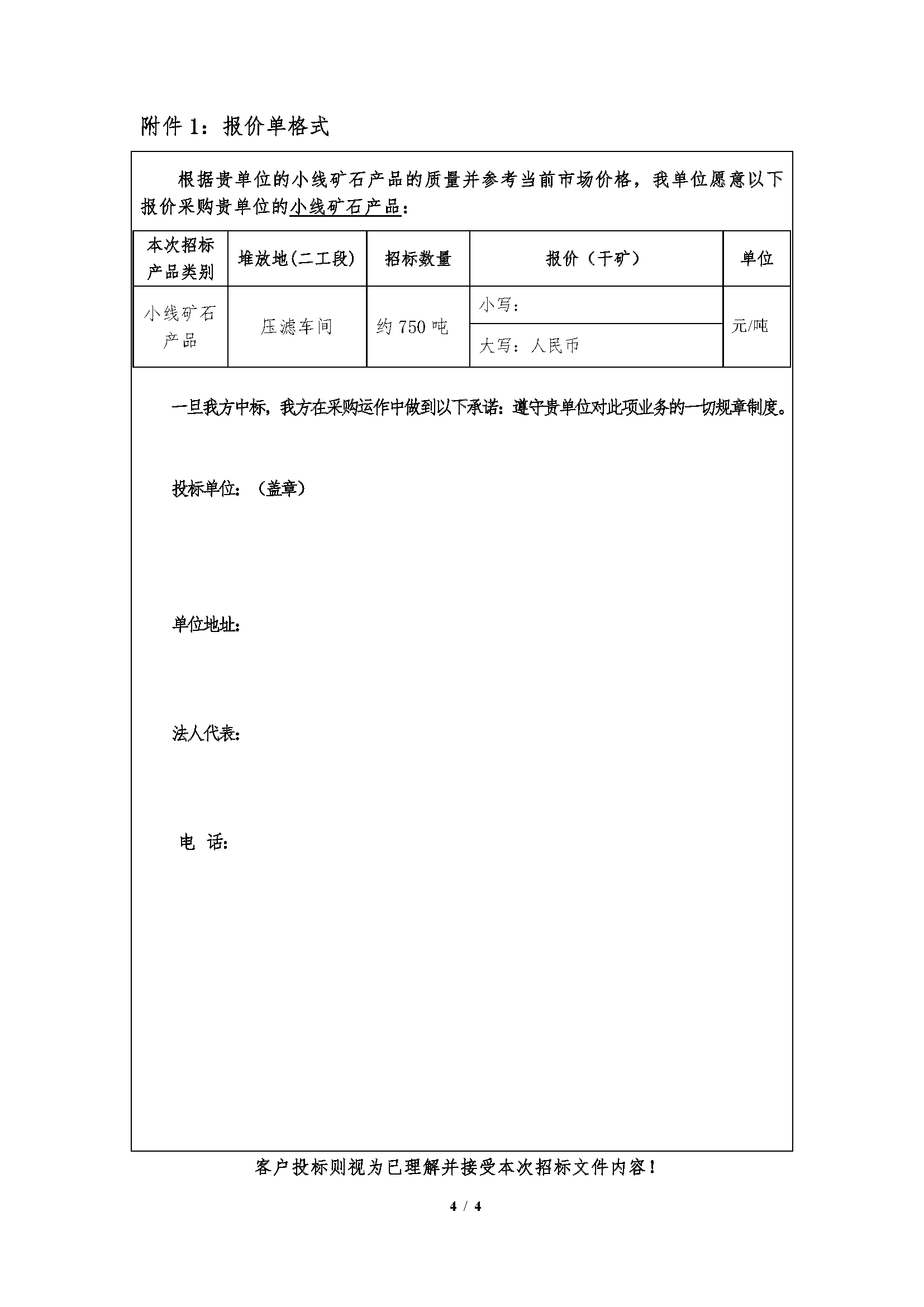 2.本次招標為一次性報價,在標書報送(sòng)截止後現場製定底標(biāo)並立即進行開標。高於底標的最高報價單位(wèi)為中標單位,報價全(quán)部低於底標為流標;開標時符合投標要求的投標(biāo)人少於三家則為流標;若投標人中標後放棄中標資格的,我(wǒ)公司扣留全額投標保證金,不予退(tuì)回;招標結束之後中標人必須在3個工作日內付清100%貨款到(dào)賬。
