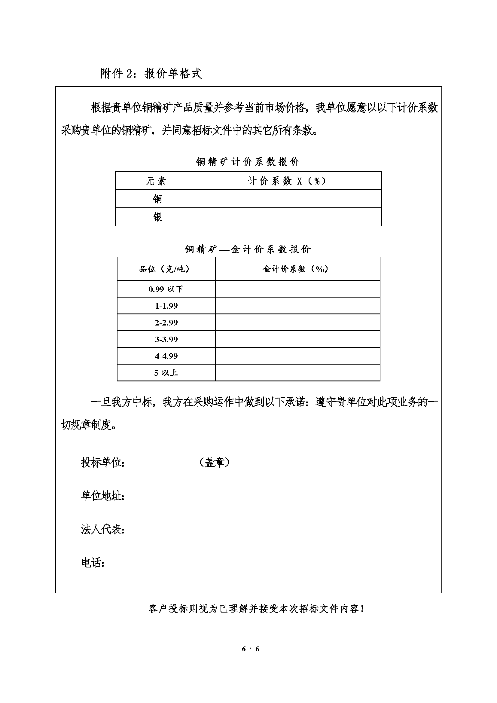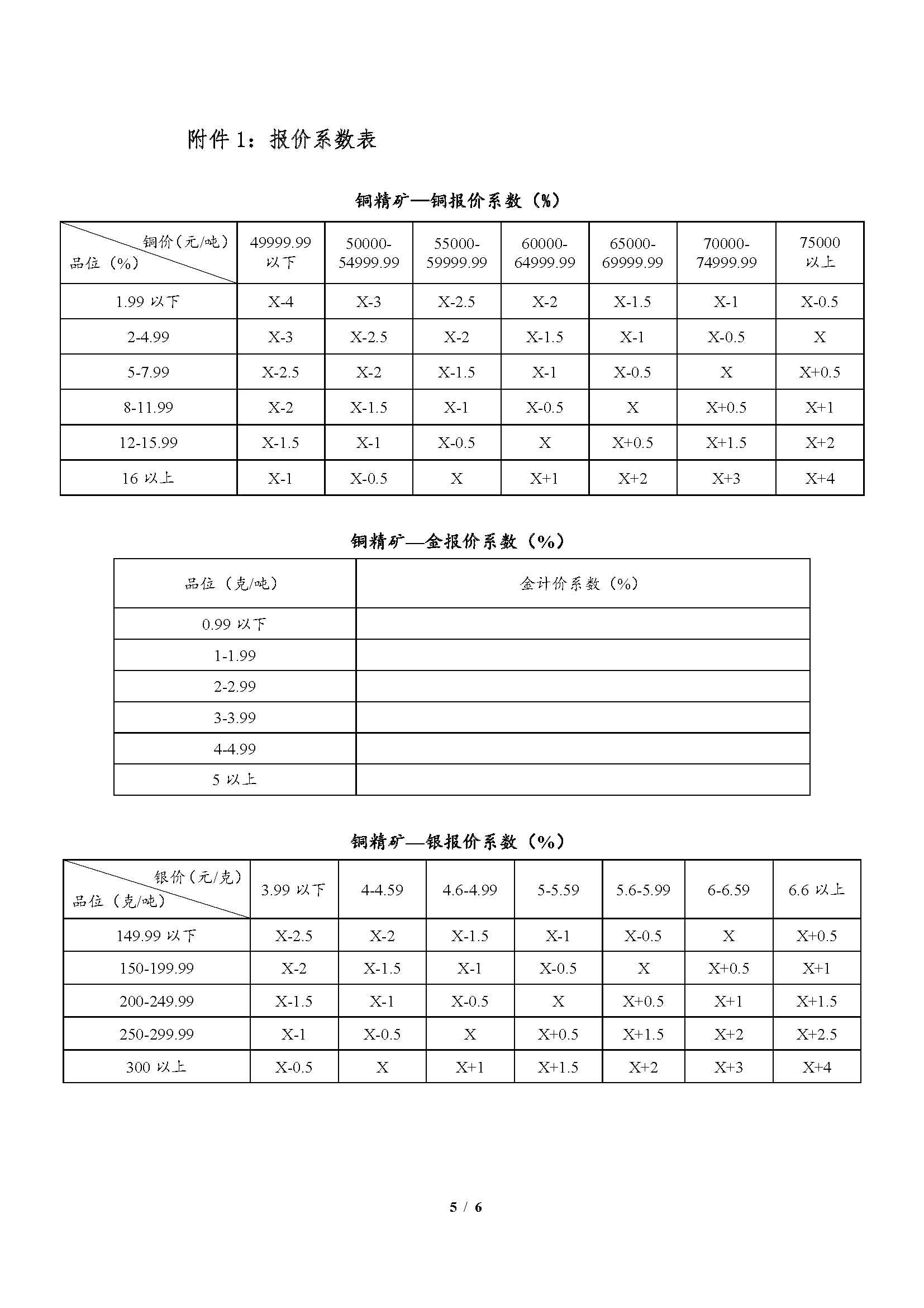2.本次招(zhāo)標為一次性報(bào)價,在標(biāo)書報送(sòng)截止(zhǐ)後現(xiàn)場製(zhì)定底標並在規定時間內進行(háng)開標。本次招標以我單位檢測的本批次礦各元素平均品位對應的報價係數測算出綜合單價,每幹噸礦(kuàng)計算(suàn)的價值最高者得。