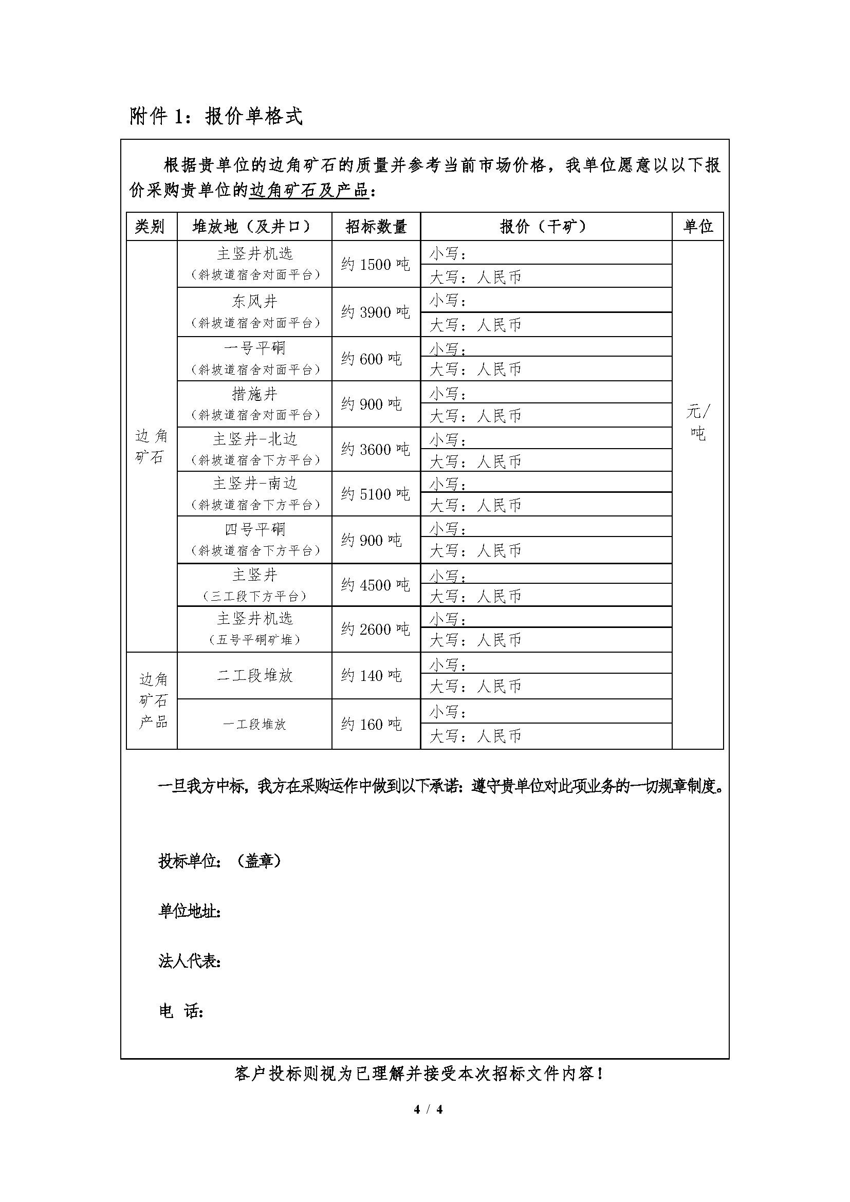 注:本次招標產品數(shù)量為預估數,投標按幹礦報價,中標結算濕礦以實際過磅數為(wéi)準,水分按2%扣除計算幹礦;邊角礦石產品水(shuǐ)分由中標人及我公司相關科室、車間人員現場取(qǔ)樣、我(wǒ)公司化驗的水(shuǐ)分數據為準。如中標人需要,我(wǒ)公司開具(jù)甘肅省增值稅普通發票(piào)(黃金)。
