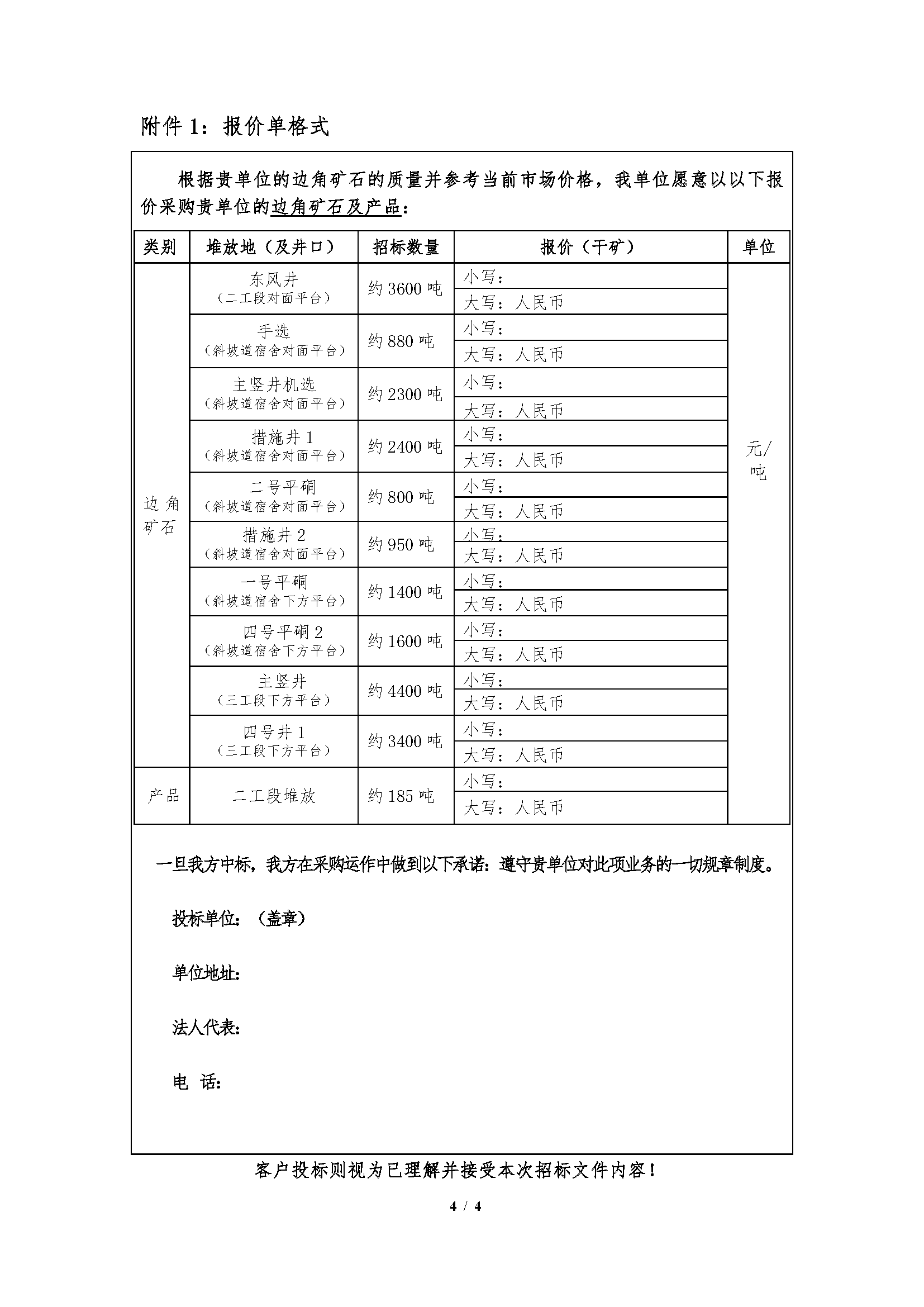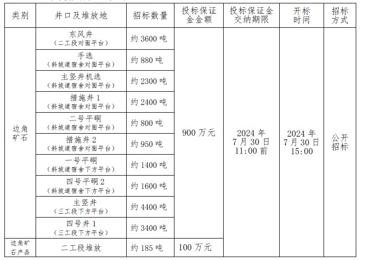 注:本次招標產品數量為預估數,投標按幹礦報價,中標結算濕礦以實際過磅數為準,水分按2%扣除計算幹礦;邊角礦(kuàng)石產品水分(fèn)由中標人及我公司(sī)相關科室、車間人員現場取樣、我公司化驗的(de)水分數據為準。如中標人(rén)需(xū)要,我公司開(kāi)具甘(gān)肅省增值稅普通發票(黃金)。