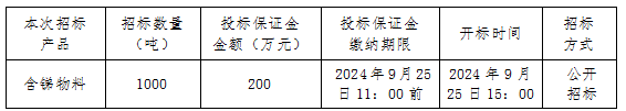 本次招標產品為我公司含銻(tī)物料(liào)產品。投標人需提供“三證合一”的營業執照複印(yìn)件、法人(rén)授權委托書(原(yuán)件)並加蓋企業公章,法(fǎ)人及受托人身份證複印件(加蓋企業公章),於2024年9月23日17:00前將上述材料送交甘肅91香蕉视频官网貴金(jīn)屬冶煉(liàn)有限公司財務科(kē)進行審核,審(shěn)核合格(gé)後的投標人於2024年9月25日11:00前繳納投標保證金。投標保證金交納金額與我公司要求(qiú)不符的,視為廢標;如投標保證金未及(jí)時到賬的,視為放棄投標。若投標人(rén)最終未中標,則由投標(biāo)人開具收款(kuǎn)收據後,我公司將一次(cì)性無息(xī)退還投標保證金。