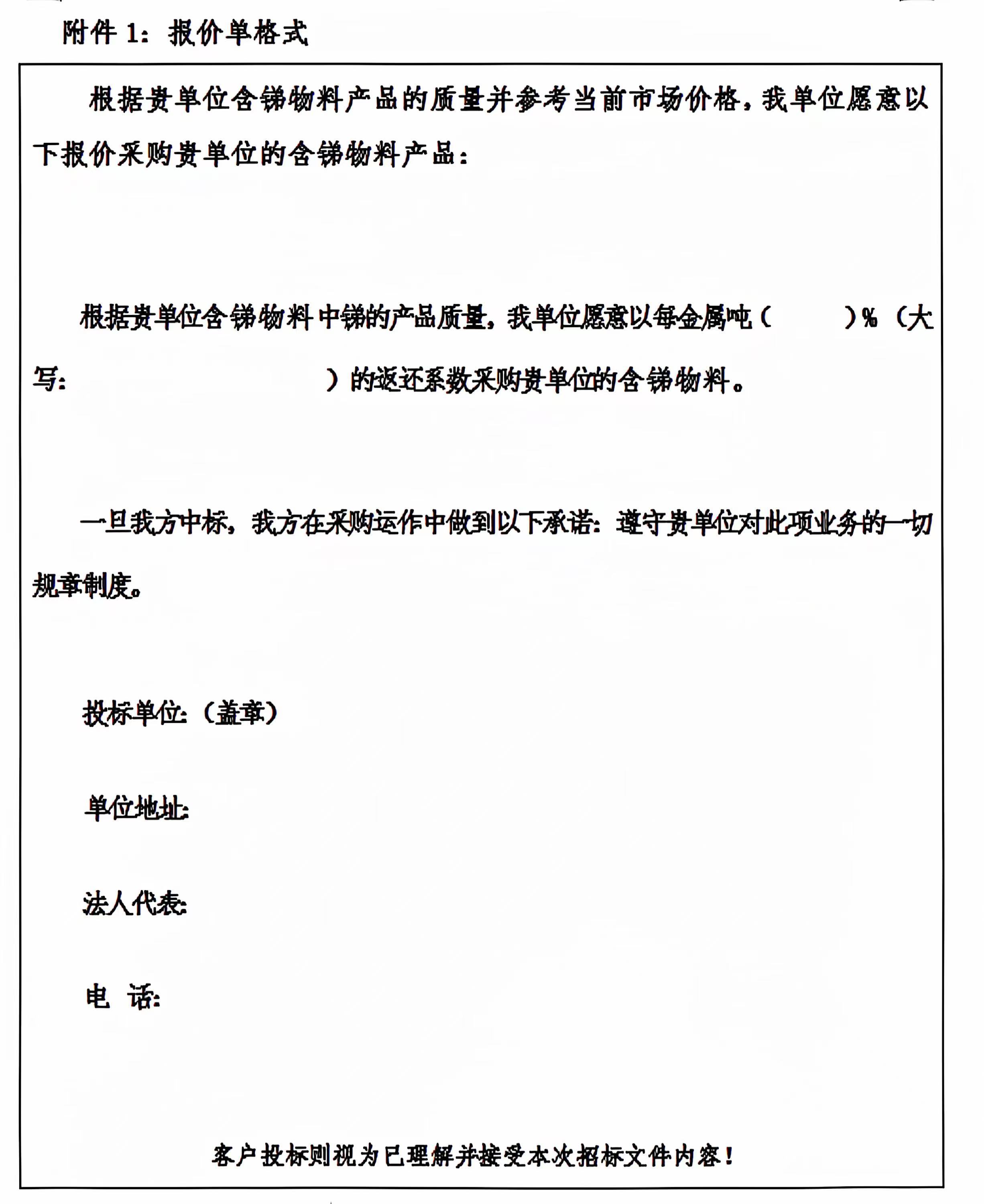 本次招標含銻物料以每噸(dūn)幹重中銻含量的返還係數進行報價。